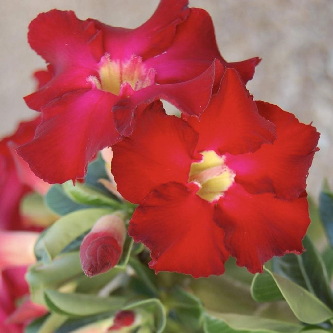 Главной изюминкой этого вида адениума является необычная пестрая листва. Адениум (Desert Rose) относится к долгожителям. У нас выращивается как комнатное. В домашних условиях вырастает до 0,5 м. Фантастический по красоте алый цветок. Цветет Адениум в основном с весны по осень. При соблюдении оптимальных условий выращивания может цвести почти круглогодично. Существуют экземпляры, возраст которых насчитывается более 75 лет. По утверждению разводчиков, эти растения способны жить до 200 лет, переходя из поколения к поколению