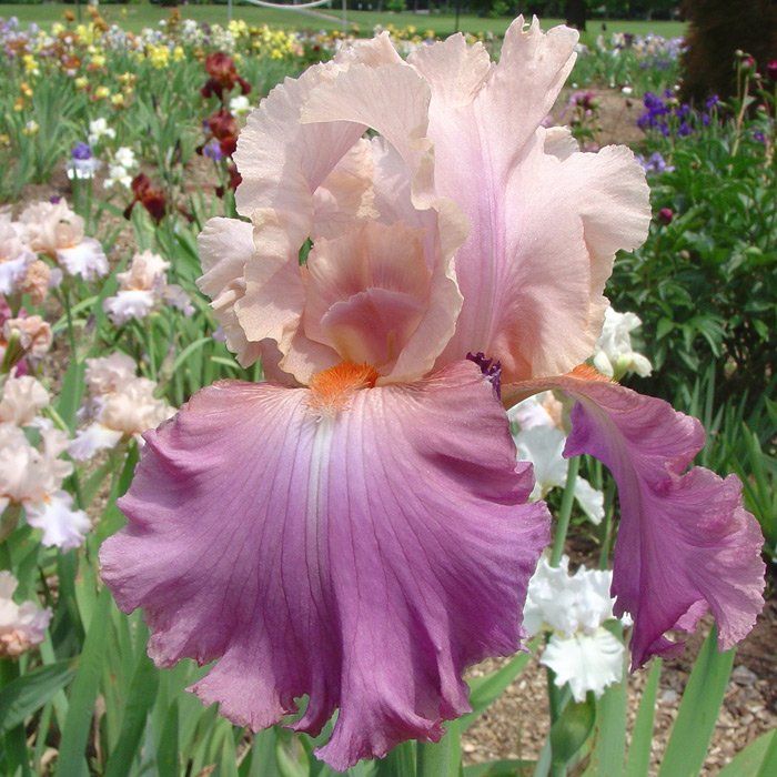 Ирис Весенняя мелодия раскрашен в самые модные оттенки сезона: его стандарты персиковые, с едва уловимым оттенком розового, а фолы облачились в насыщенный вишнёво-пурпурный цвет. Ободок фолов светло-розовый, ажурный. Яркая оранжевая бородка выполняет связующую роль в цветовом сочетании, предотвращая слишком контрастный переход от одного оттенка к другому. Таким образом, перед нами хоть и двуцветный ирис, однако с невероятно гармонично сочетающимися друг с другом цветами.<br>