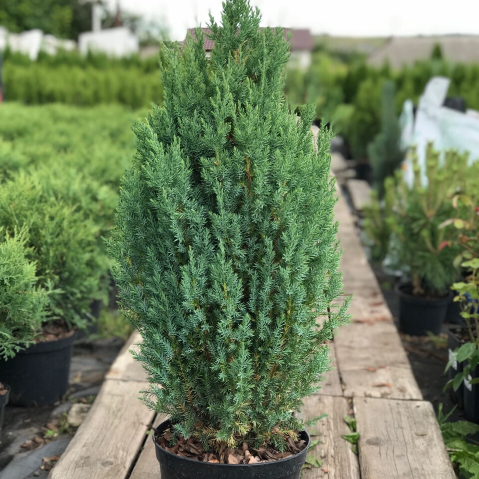 Можжевельник Stricta - сорт узко-пирамидальный с острой верхушкой, плотный. Скелетные ветки приподнятые, густые. Хвоя игловидная, голубовато-зеленая, снизу серебристая. Зимой коричневатая.